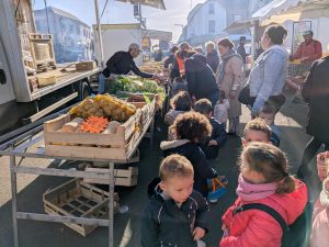 Le mardi 17 mars, les 15 élèves de la classe de Toute Petite Section de l’école F Vadis ont pris le chemin du marché pour une sortie placée sous le signe du goût et de la découverte. Munis de petits paniers et de plusieurs listes de courses bien préparées en classe, ils avaient une mission importante : acheter les légumes nécessaires à la préparation d’une soupe.