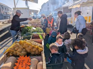 Accompagnés de leur enseignante Mme Duval, de l’ ATSEM, Béatrice et de 4 parents, les tout-petits ont observé les étals colorés, appris à reconnaître les légumes de saison et échangé avec les commerçants. Ils ont choisi des carottes, des pommes de terre, des poireaux et même un butternut, avant de passer à la caisse pour régler leurs achats comme des grands.